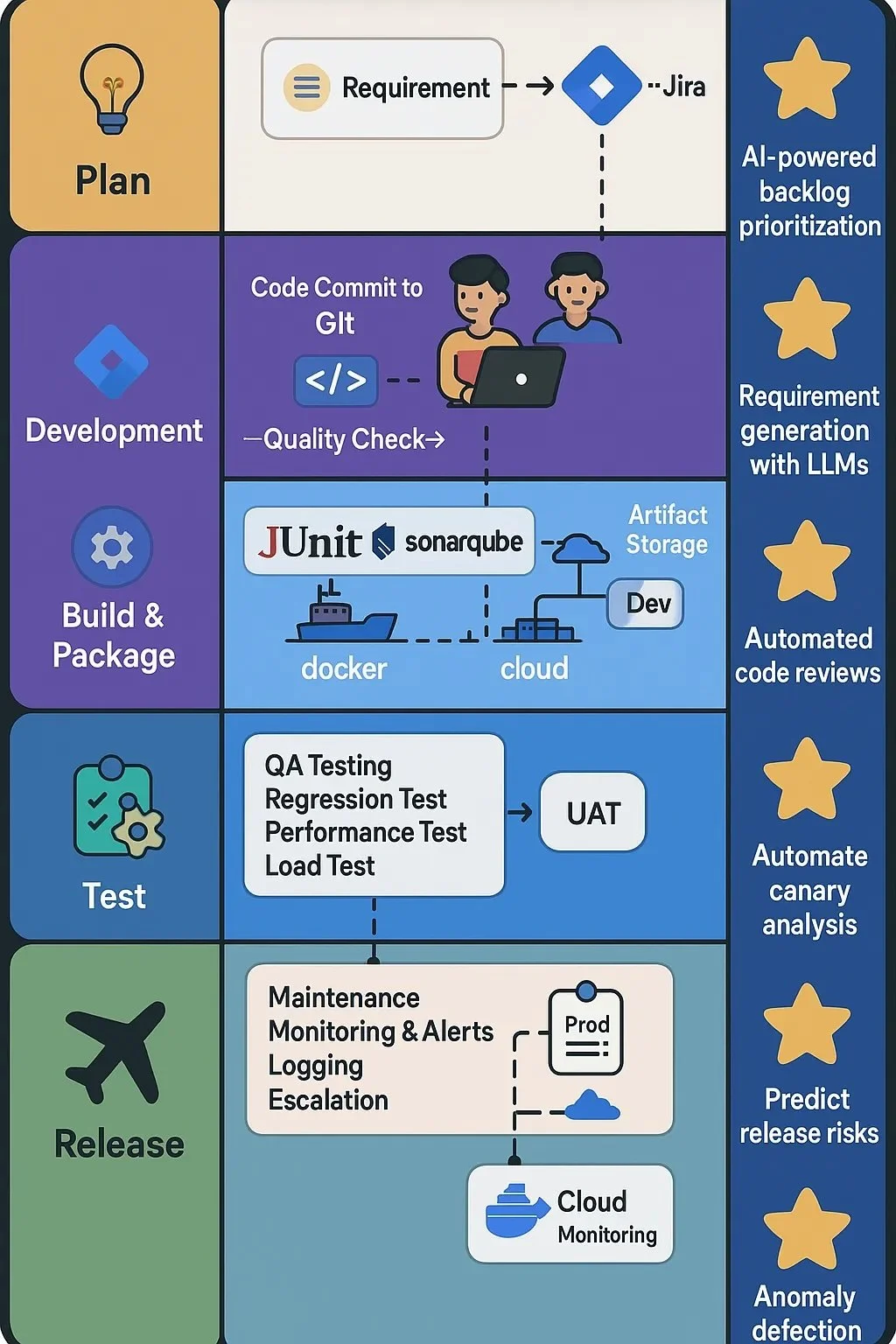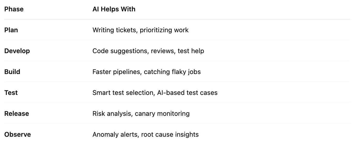 Before we jump into the details, here’s a quick look at how software goes from an idea to something real — and how AI adds value at each step: