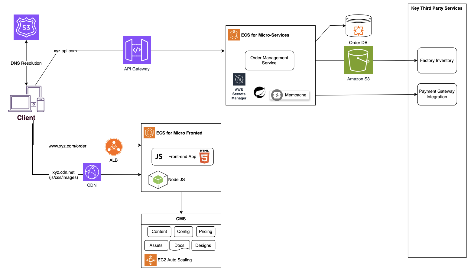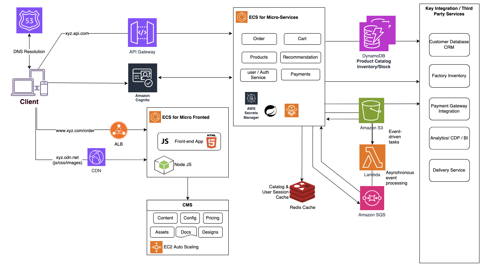 Decoupled headless CMS and front-end, served via CDN. Services moved to ECS microservices with dynamic inventory and payment integrations.
